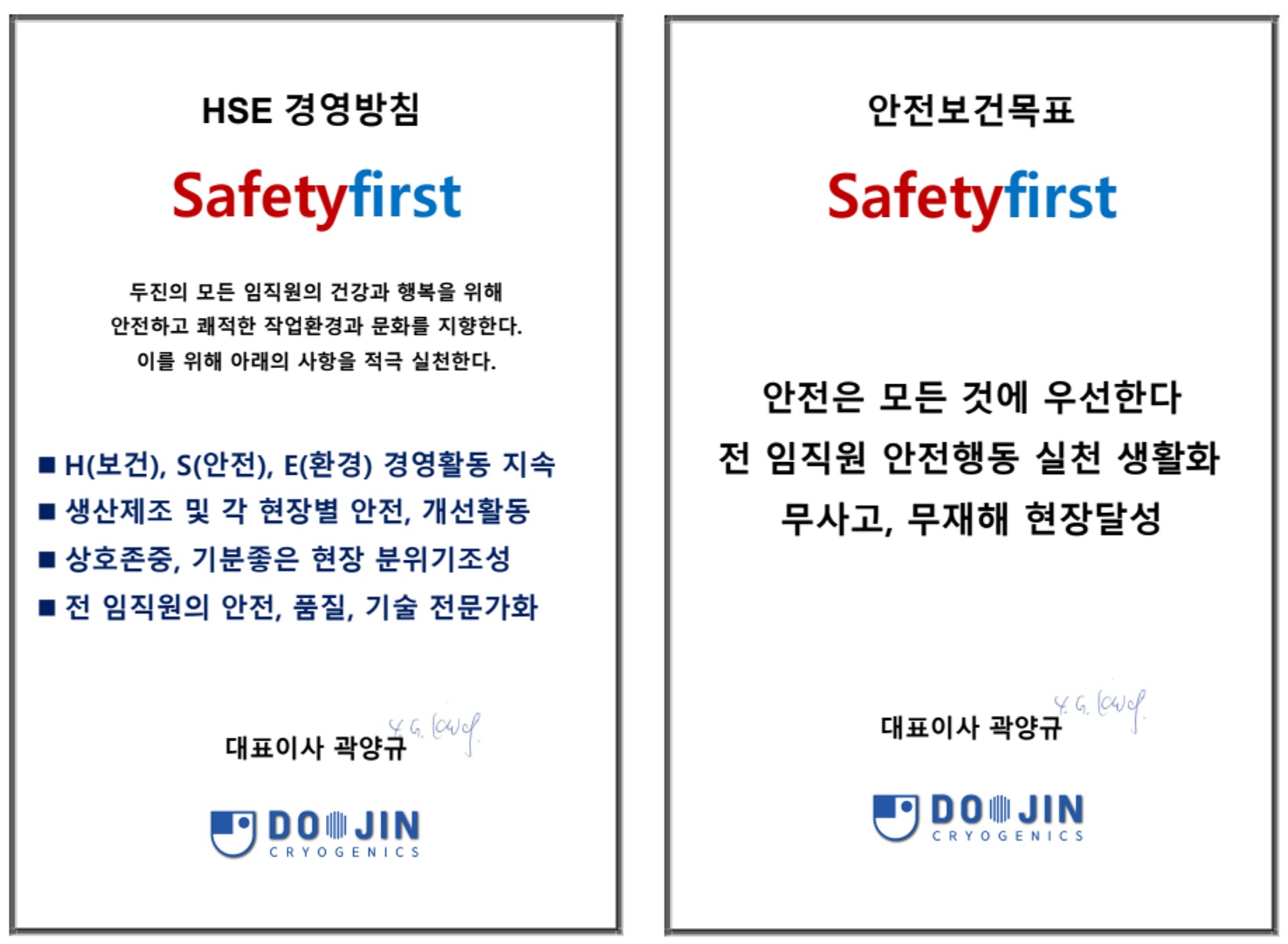 두진은 모든업무에 기본과 원칙을 지키는 것이 가장 중요하다고 생각합니다. 두진은 정직, 겸손, 열정을 강조하고 있습니다. 전 임직원의 업무하나 하나는 초저온 액화가스 처럼 투명하게 처리하고 회사의 자산을 보호하고 잠재적인 경영 리스크를 원천적으로 차단하고 보호할 것 입니다.