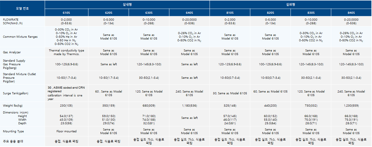 가스 믹서기는 사용자가 공정 중에 필요한 혼합가스를 직접 현장에서 생산 및 공급할 수 있는 장비로서 사용목적에 따라 공업로용(furnace treatment), 용접용(welding), 반도체용(semiconductor), 식품용(food packaging) 등 다양한 목적과 용도에 따라 사용되고 있습니다.