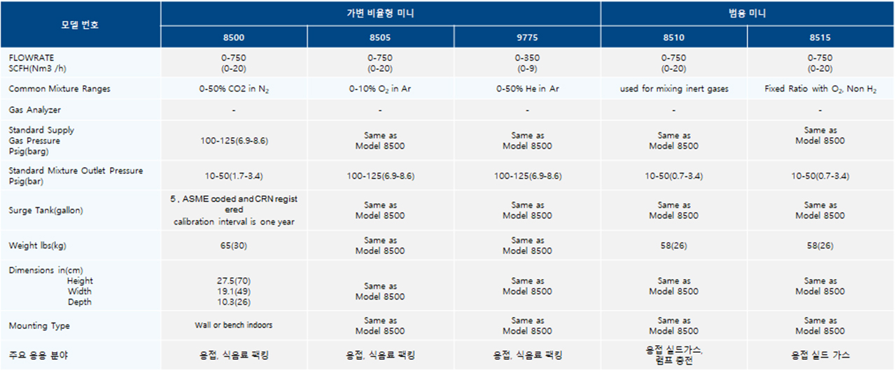 - 정확한 혼합 상태를 유지하면서 750에서 0 SCFH로 무한한 유량 감소가 가능