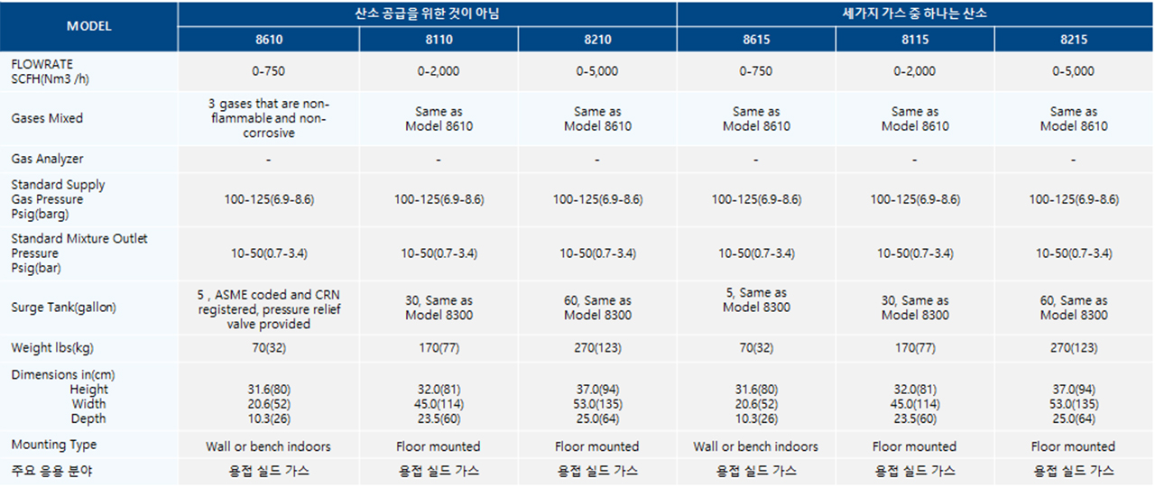 - 이 시스템은 용접을 위한 실드 가스와 같이 연속적으로 매우 안정적인 혼합 가스 생산이 필요한 응용 분야를 위해 설계